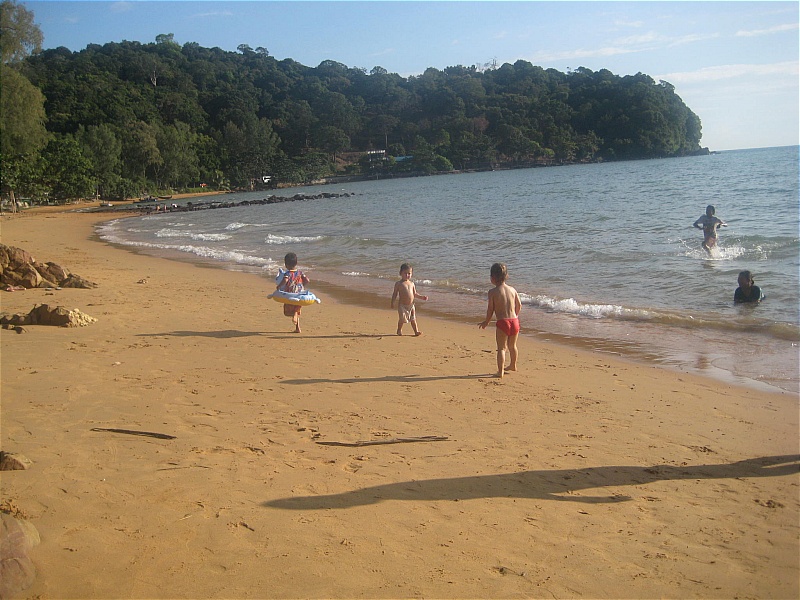 | Chilling on the beach in Thailand (this will be our local beach when house is built) Jasmin in red and Sasha in the middle |
